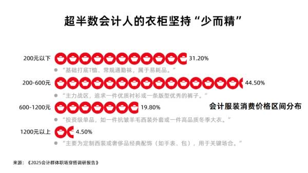 精打細(xì)算的職業(yè)本能,深刻影響了他們的消費(fèi)觀。企業(yè)會(huì)計(jì)的衣櫥堪稱“高效資產(chǎn)配置”。58.7%的人奉行“少而精”原則,愿意為核心單品支付更高單價(jià),追求更優(yōu)的材質(zhì)和更長(zhǎng)的穿著周期。