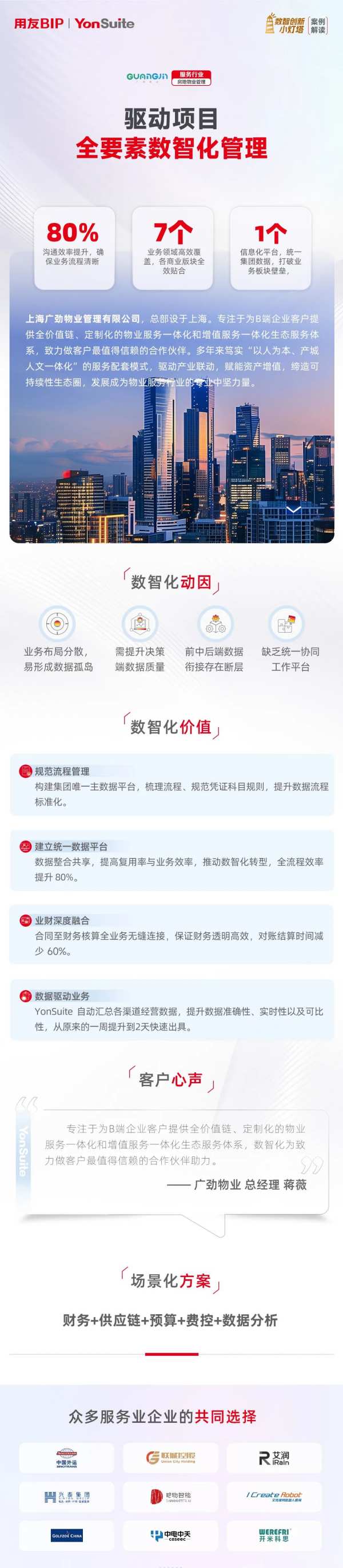 上海廣勁物業(yè)管理有限公司財(cái)務(wù)總蔣薇說:“我們一直專注給 B 端企業(yè)客戶,打造全流程、定制化的物業(yè)服務(wù)和增值服務(wù)生態(tài)。這次和用友 YonSuite 合作搞數(shù)智化,就是想成為客戶最靠譜的伙伴。” 從蔣薇這番話能看出來,廣勁物業(yè)下定決心,要用數(shù)智化升級物業(yè)服務(wù)。事實(shí)證明,這次轉(zhuǎn)型特別成功,不僅解決了數(shù)據(jù)不通、流程卡殼的老問題,還搭建起一套完整的項(xiàng)目數(shù)智化管理體系,給以后提升服務(wù)、拓展業(yè)務(wù)打下了堅(jiān)實(shí)基礎(chǔ)。